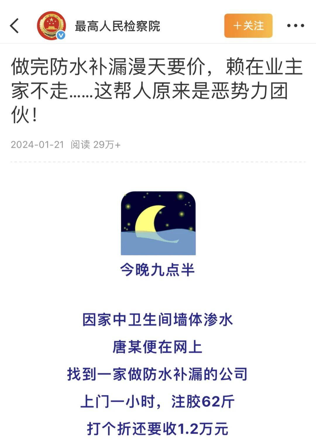 小柴随后展现,如许的骗局也不是个例,客岁就有媒体报道,正在杭州,有消费者正在网上找到一家做防水补漏的公司,上门一小时,注胶62斤,打个折还要收1.2万元……